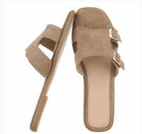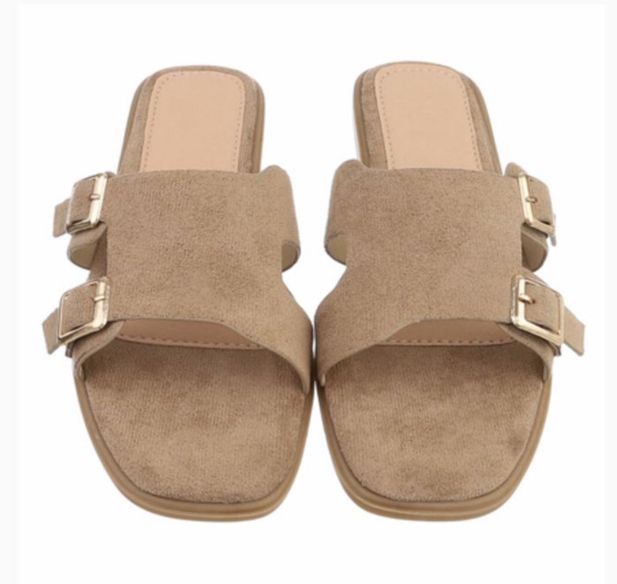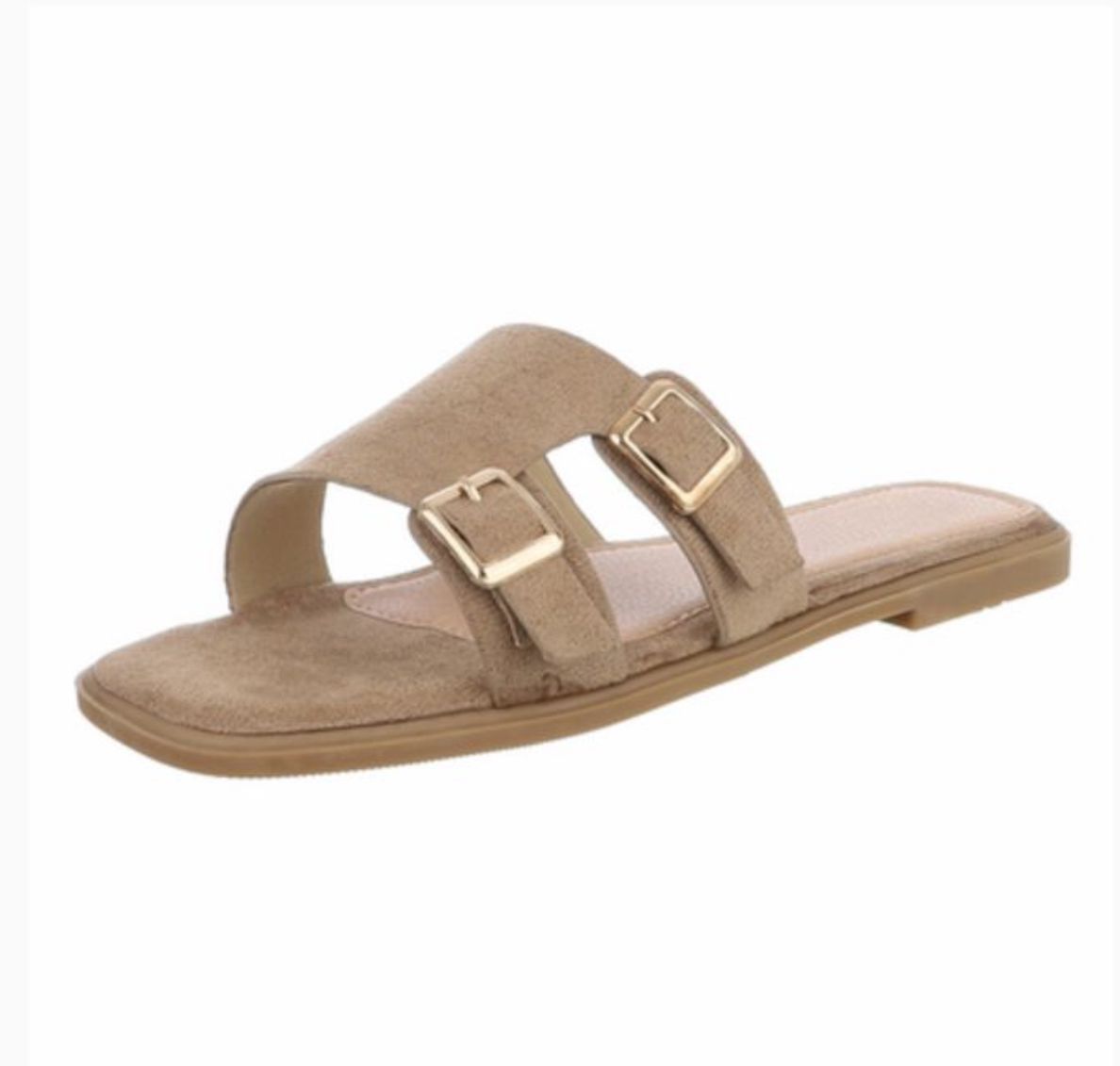 Sandales plates élégantes et confortables. Brides avec boucles dorées. Parfaites pour un look estival décontracté et chic.